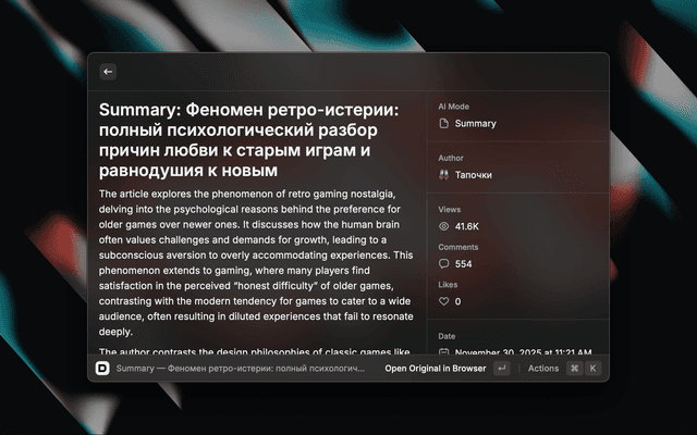Ctrl + Shift + S | Quick TLDR | Generate one-line summary (copies to clipboard) |