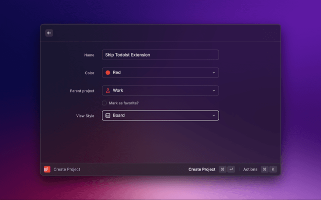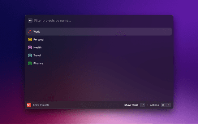 Home command and select your view in the dropdown (e.g All Tasks or a specific project)Create View Quicklink in the actions (⌘ + K).⌘ + ⏎).This makes it easy to access any of your views, including projects and labels!