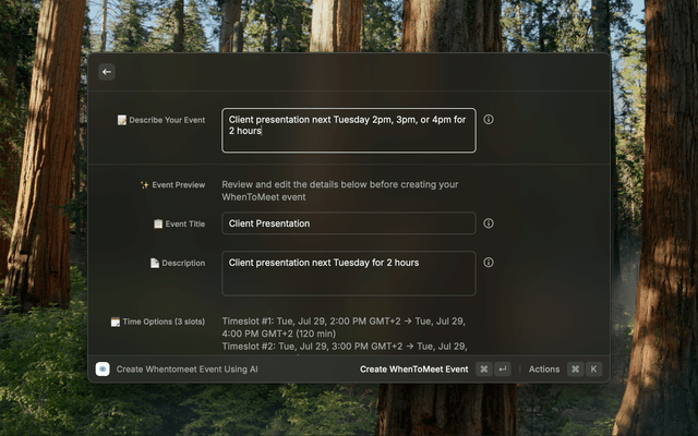 Create WhenToMeet scheduling events from the raycast interface or using AI. This extension is using the WhenToMeets event creation URLs to create events.