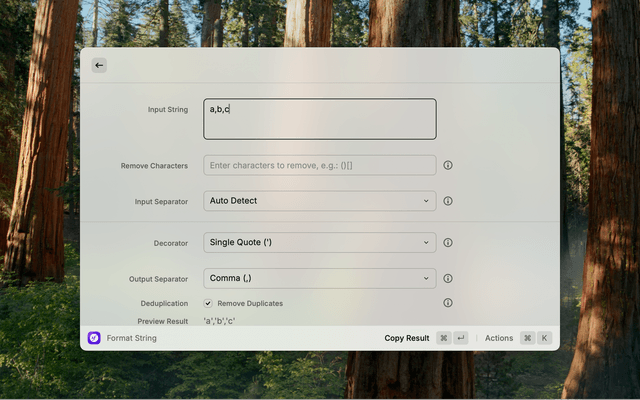 Input: a,b,c Input Separator: Auto Detect (detects comma) Decorator: Single Quote (') Output Separator: Comma (,) Deduplication: โœ… Enabled Output: 'a','b','c'