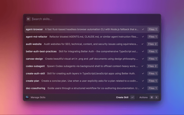 • Codex: Skills: create and manage skill folders and SKILL.md files (import ZIP supported).