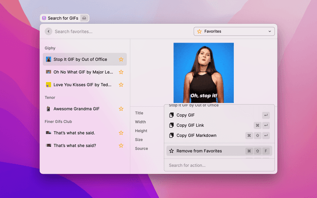 Elevat your Mac workflow with the GIF Search extension. This extension searches for animated GIFs from the internet using Giphy, Tenor, or The Finer Gifs Club. Switch between the various services using the search bar dropdown.