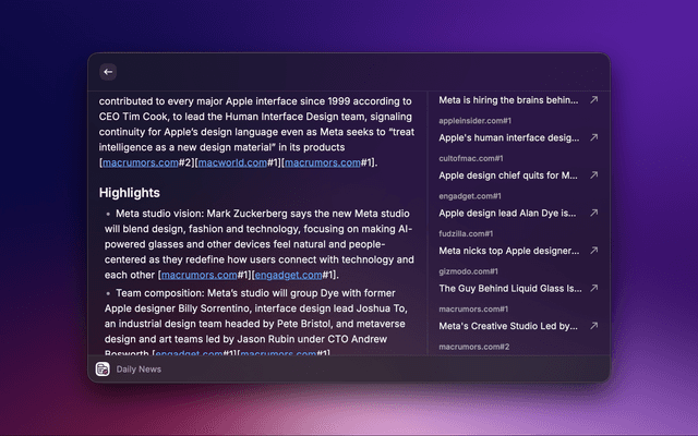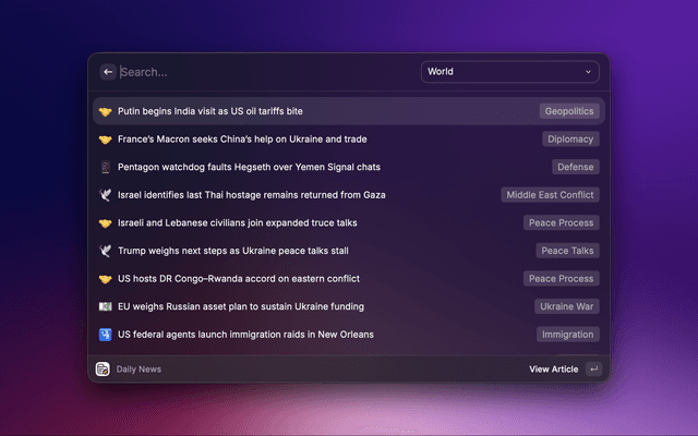 - Open Raycast, type Daily/Kagi News, select a category, and browse articles.