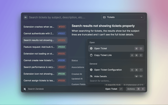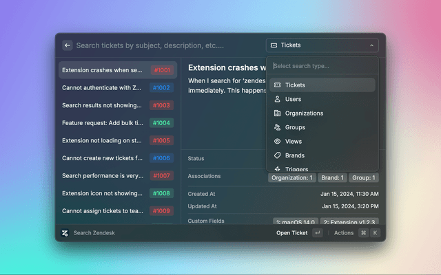 A Raycast extension for comprehensive Zendesk administration. Search, view, and manage all aspects of your Zendesk instances directly from Raycast.