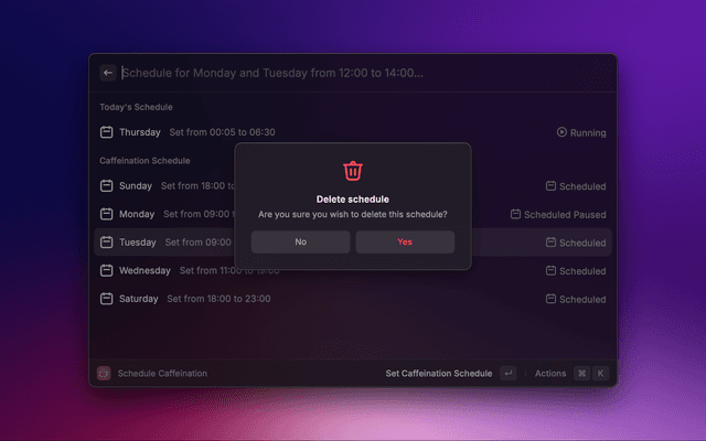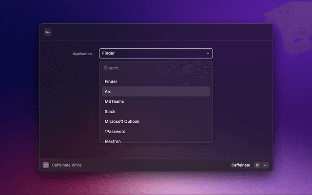 Coffee is a Raycast extension designed to manage the caffeination of your Mac. Whether you want to keep your Mac awake for a specific period, while a particular app is running, or on a schedule, Coffee has you covered.