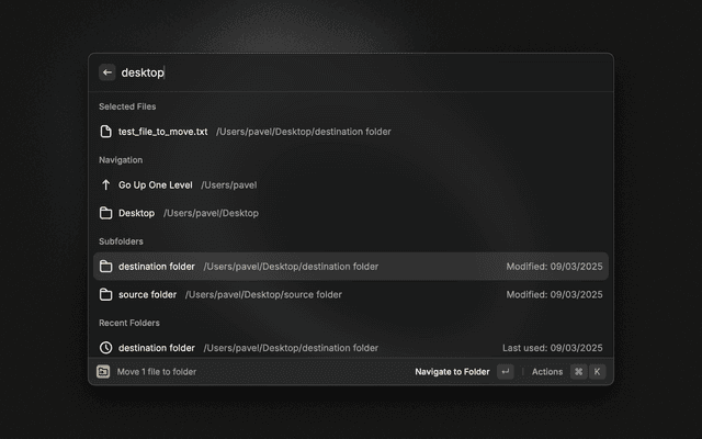 mdfind)Enter: Navigate to the selected folderCmd+Return: Move files to the selected folderCmd+Shift+Return: Copy files to the selected folderCmd+Shift+D: Toggle details viewCmd+Shift+P: Pin/Unpin folderCmd+Shift+R: Remove folder from recent history[!IMPORTANT] this extension is not available yet in the Raycast store. You can see the ticket here, so if you want to see it in the store, you can upvote it or smth. in the meantime, you can install it manually.
