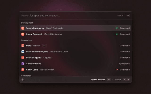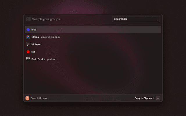 Search your bookmarks by group. Open in the browser, copy the value to the clipboard or delete your bookmark.