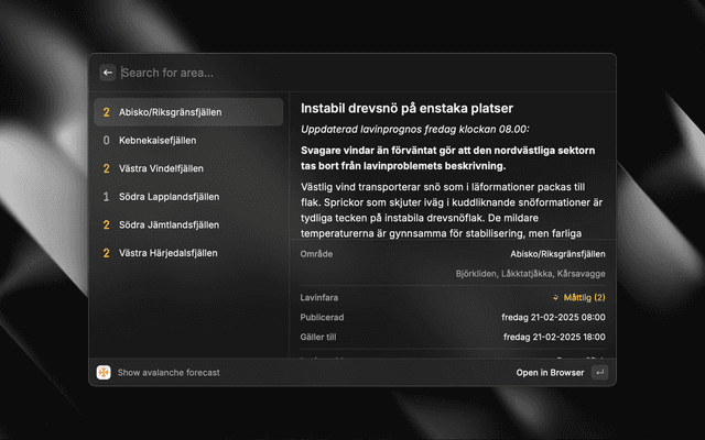 All data is fetched directly from Lavinprognoser.se. Please check the full avalanche forecast on Lavinprognoser.se before you go out.